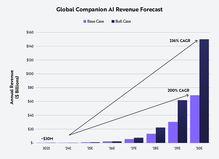 AI伙伴进一步加深了用户沉浸感,并建立了动态的关系,例如Web2平台Replika和Character.AI,这些平台满足了对个性化AI驱动体验的不断增长的需求。随着大型语言模型革命性地改变内容创作,AI伙伴关系也有望显著增长,全球收入预计从今天的3000万美元增长至本世纪末的700亿美元至1500亿美元之间。