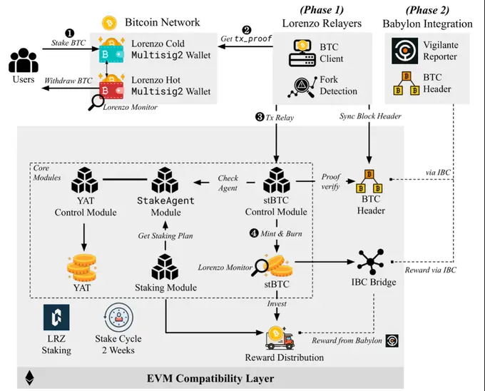 Lorenzo 显然希望在这一赛道中集大成于一体。在 Babylon 开启质押功能后,其 LST 产品具备了与 stETH 、 Renzo 、 EtherFI 等 LRT 资产类似的本息分离操作性。 Lorenzo 的 LST 产品可以被拆分为两种代币:流动性本金代币 LPT ( st BTC )和收益累积代币 YAT 。两种代币均可自由转让和交易,持有者可以分别利用它们获取收益或提取质押的 BTC 。这种设计不仅提升了资产的灵活性,还为用户提供了更多的投资选择。