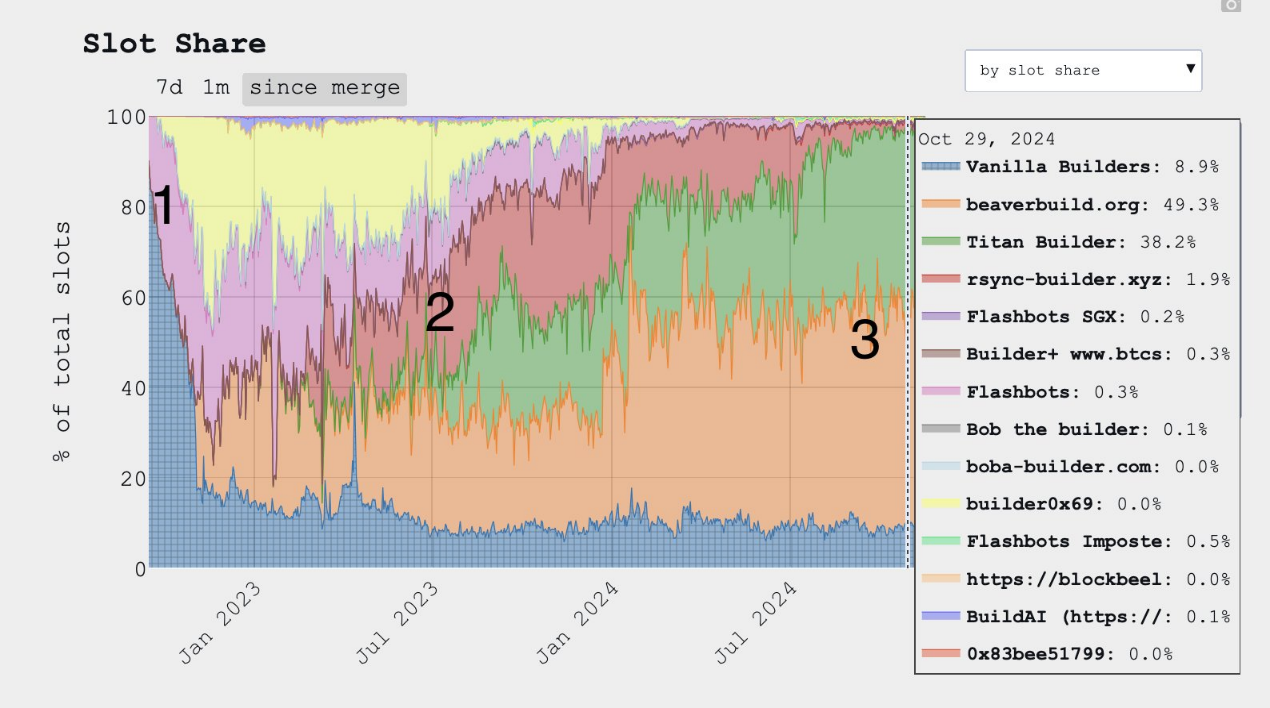 参考下图,最初 (#1) Flashbots (粉色) 是唯一运行的“Builder”,半年后出现了激烈的竞争 (#2)。现在,只有2个重要的构建者 (#3) :Beaver和Titan。